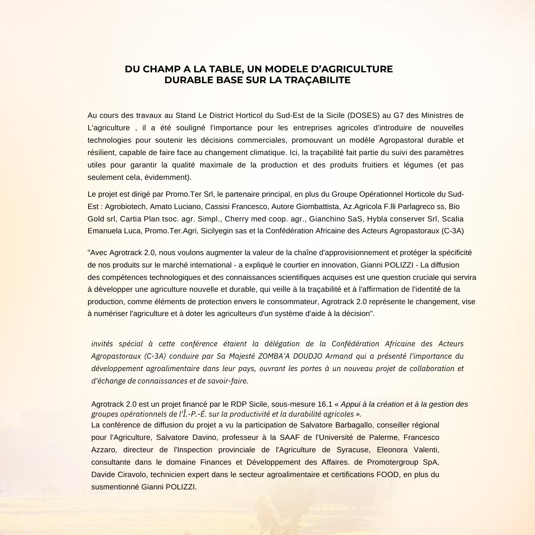 L’evento ha catturato l’attenzione della Confederazione Africana degli Attori Agropastorali (C-3A), che ha menzionato Agrotrack 2.0 nel suo “Rapporto della missione di avanzamento esplorativo in territorio italiano dal 21 settembre 2024 al 05 ottobre 2024”.